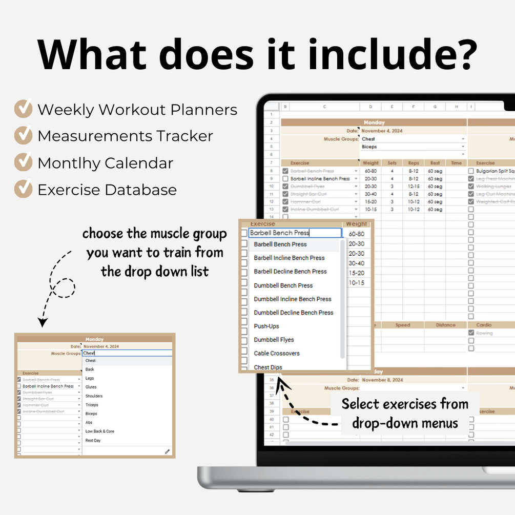 Weekly Workout, Monthly Calendar, Measurements Tracker, & More