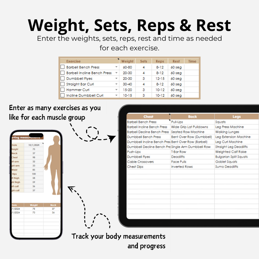 - Weekly Workout Planners: Plan up to 5 weeks of training. Customize your routine with weight, sets, repetitions, time, and rest. Mark completed exercises as you progress.